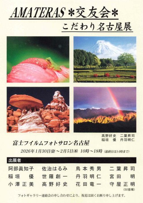 会員の佐治はるみ氏が所属しているAMATERAS*交友会*の写真展が1月30日(金)から富士フイルムフォトサロン名古屋で開催されます。ご都合がよろしければ是非ご覧下さい。